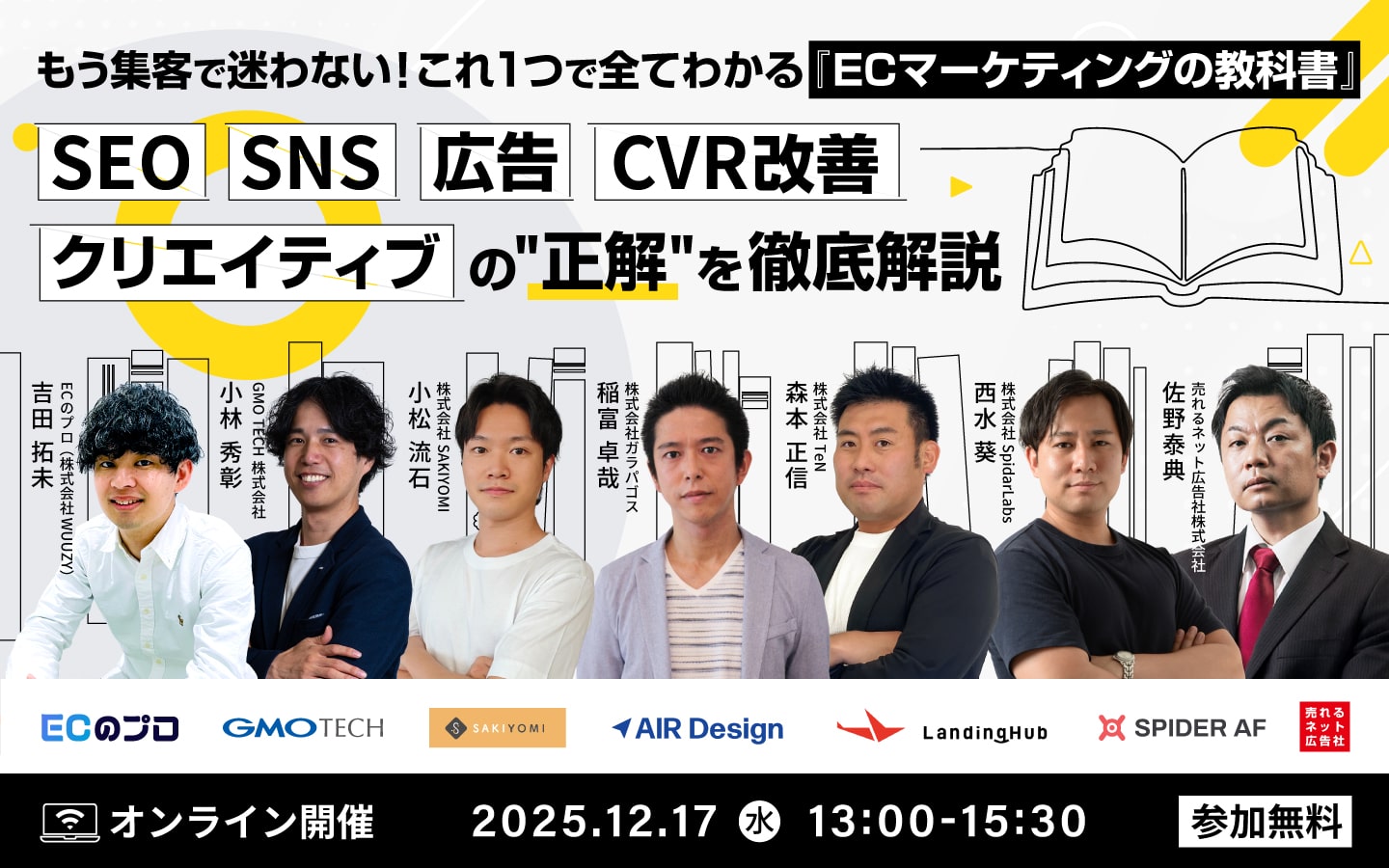 本セミナーでは、EC集客の全体像を一度で理解できる【ECマーケティングの教科書】として、SEOの基礎と改善ポイント、SNSでの効率的な認知拡大法、広告運用の判断基準、CVR(購入率)改善の具体策、そして売れるクリエイティブ制作の“正解”を、初心者でも実践できる形で体系的に解説します。