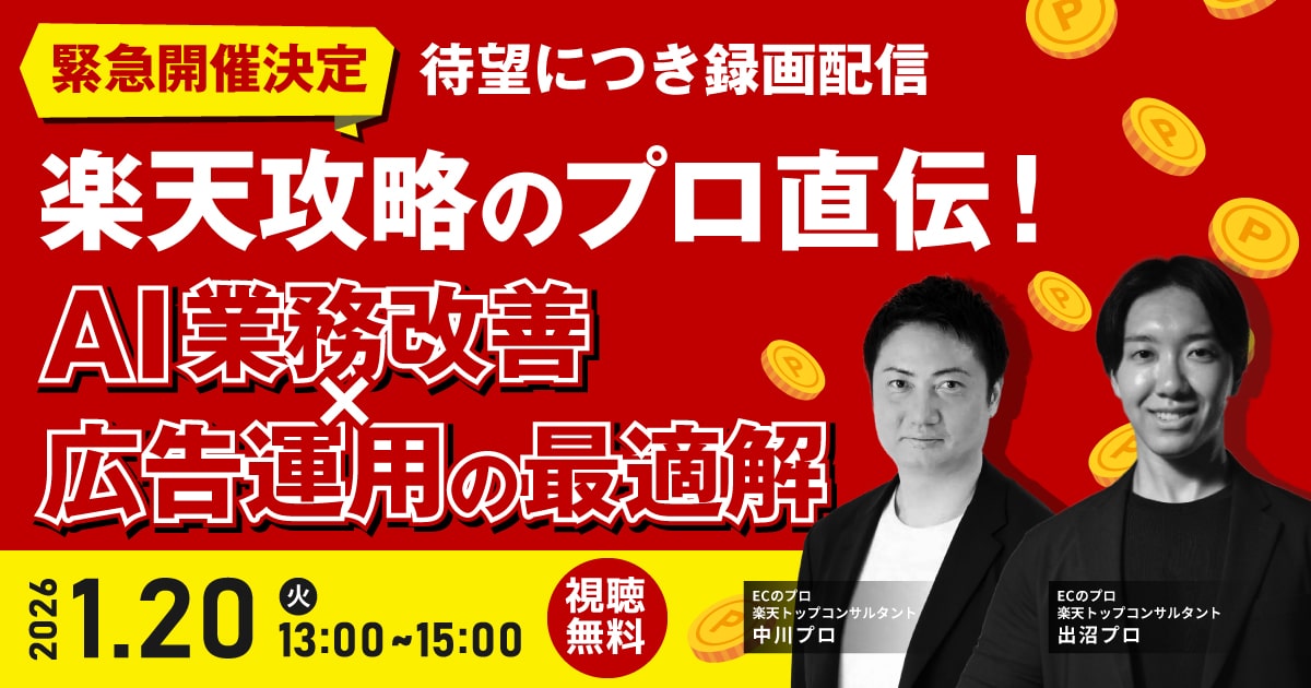 2025年7月から、楽天RPP広告に【AI自動最適化機能】が導入され、運用手法が大きく変わりました。従来、多くのEC事業者はRPP広告を手動で入札・調整していましたが、AIによる自動最適化が始まった今、設定や戦略を理解せずに放置すると、広告費はかさむのに成果が伸びない『無駄な運用』になりがちです。AI任せにしても、入稿内容や上限CPCの設定次第で結果は大きく変わるため、知識不足が直接赤字につながります。本セミナーでは、楽天RPP広告のプロが新たに変わったRPP広告の仕様をどう活用するか徹底解説します。AI自動最適化の設定ポイント、入札戦略の最適化、成果を上げる戦略設計など、具体的手法を事例とともに紹介します。さらに、セミナー中にはその場で質問も可能なリアルタイムQ&Aを実施し、個別の疑問や運用上の悩みにもお答えいたします。無駄な広告費を削減し、売上と利益を同時に伸ばす運用戦略を、プロの直接指導で学べる貴重な機会です。ぜひご参加お待ちしております!